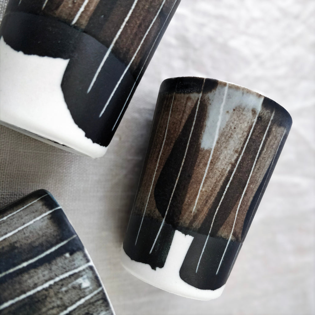 Our handmade Macchiato coffee cups are designed to provide a unique and enjoyable drinking experience. Crafted from porcelain and infused with Australian clay, it's not limited to coffee—it's also perfect for your evening whisky, favourite coffee, or hot beverage. Each piece is crafted by hand with a contemporary brush stroke design and glazed with a non-toxic, food-safe glaze.GREAT FOR: Macchiato, fresh Coffee, Whiskey or Cognac