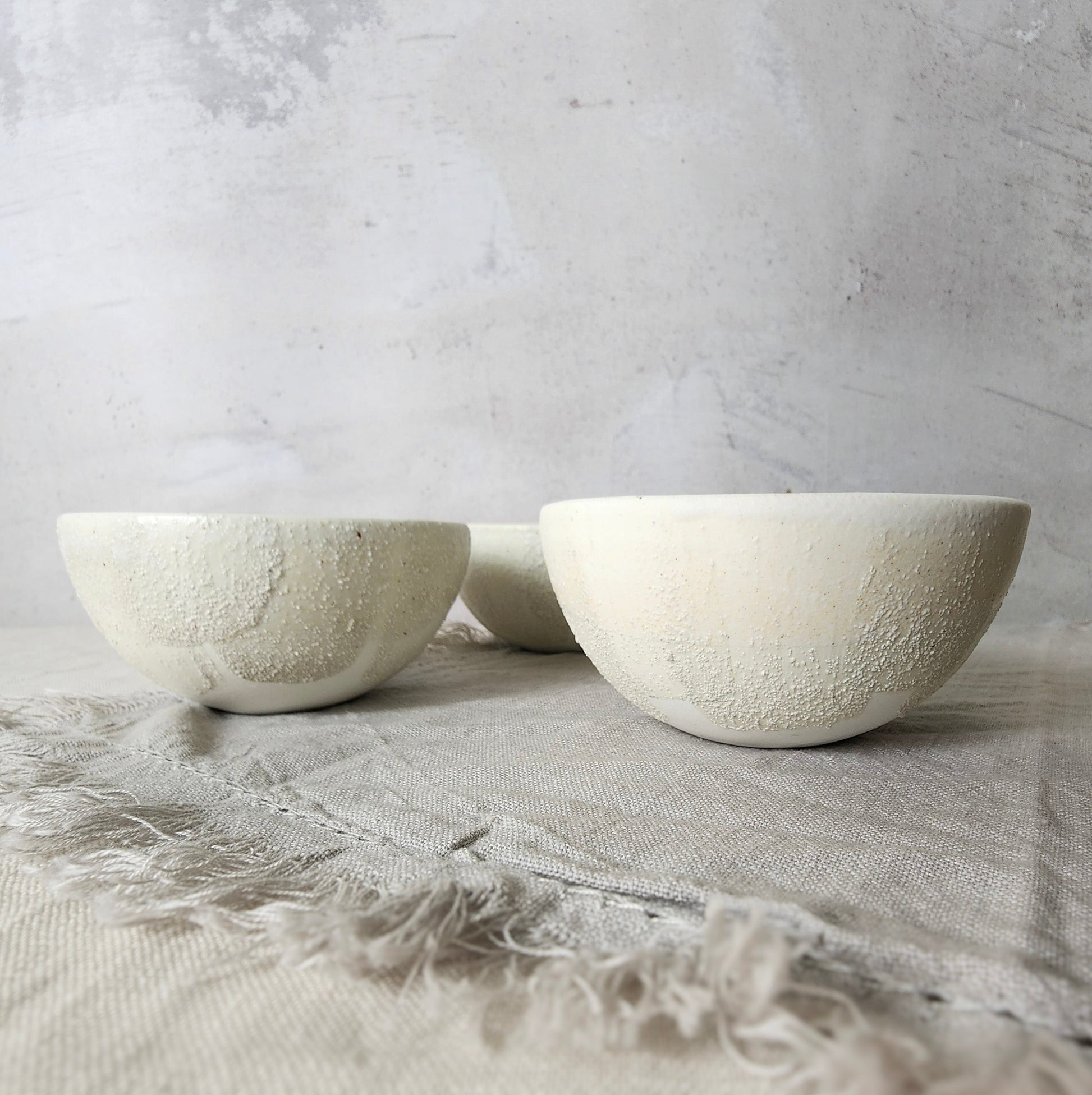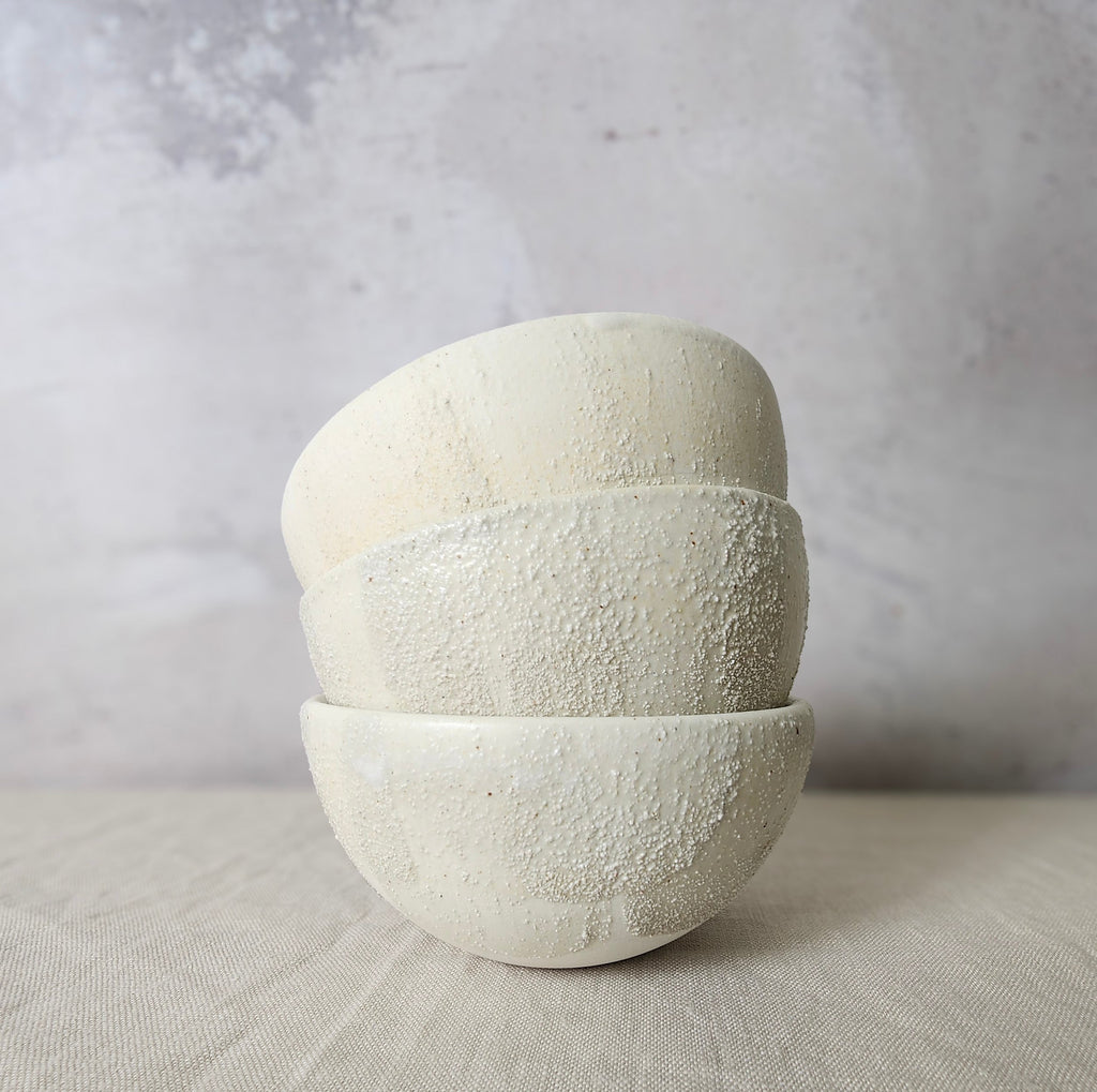 Introducing a charming assortment of hand-drawn and minimalist porcelain bowls, perfect for serving tapas or desserts with a personal flair. Designed with versatility in mind, these bowls are ideal for presenting delicious dishes and dips or for storing cherished trinkets. Crafted with care, each porcelain bowl is carefully handmade, featuring a clear gloss glaze on the interior to highlight the contents and enhanced with bold textural brush strokes on the outer surface, glazed with a soft semi-white matte finish to smooth the textured touch. Whether used for culinary delights or as decorative elements, these bowls add a touch of elegance and fun to any occasionDomestic Shipping is Free for all domestic orders over $200. All Shipping is calculated by weight & added at check out.