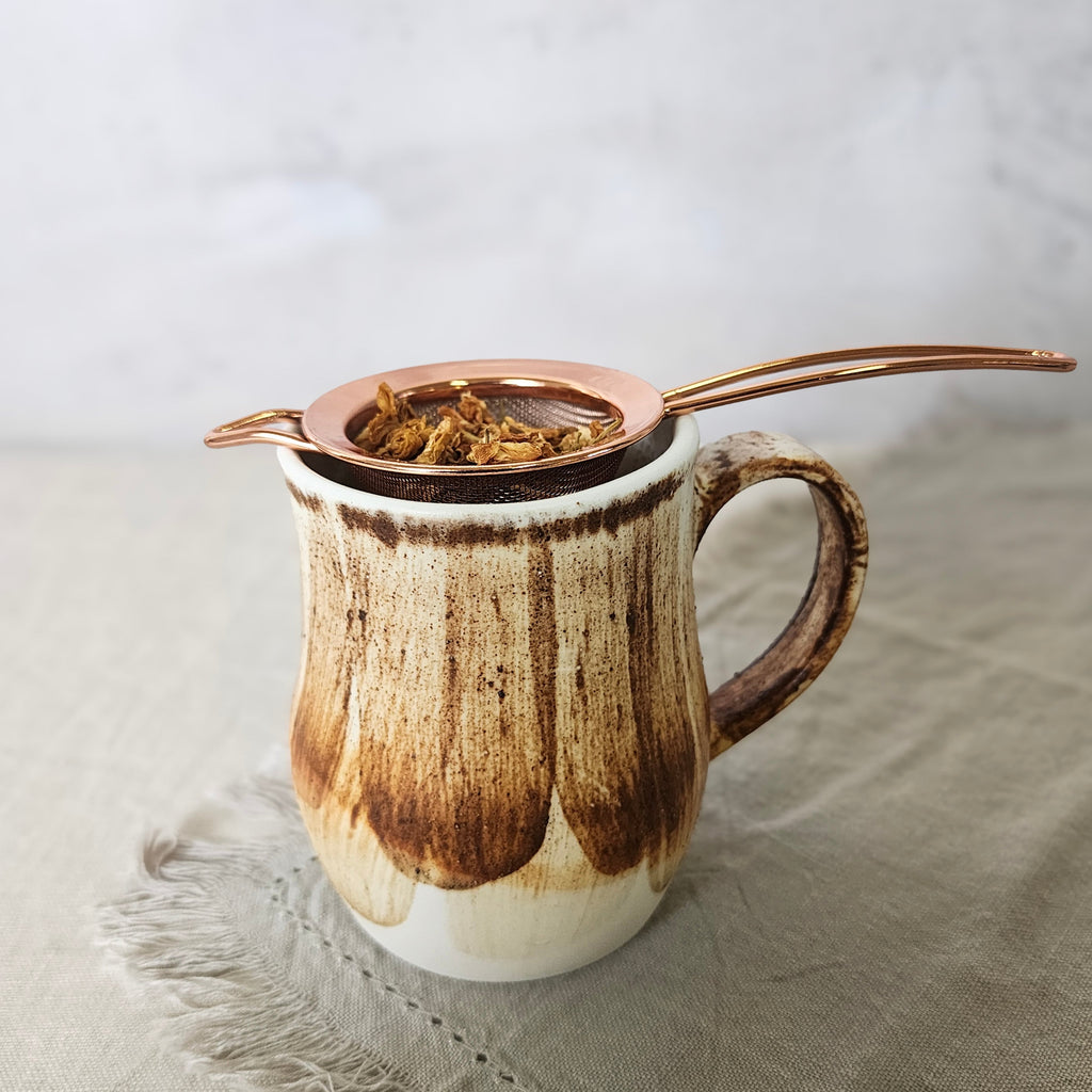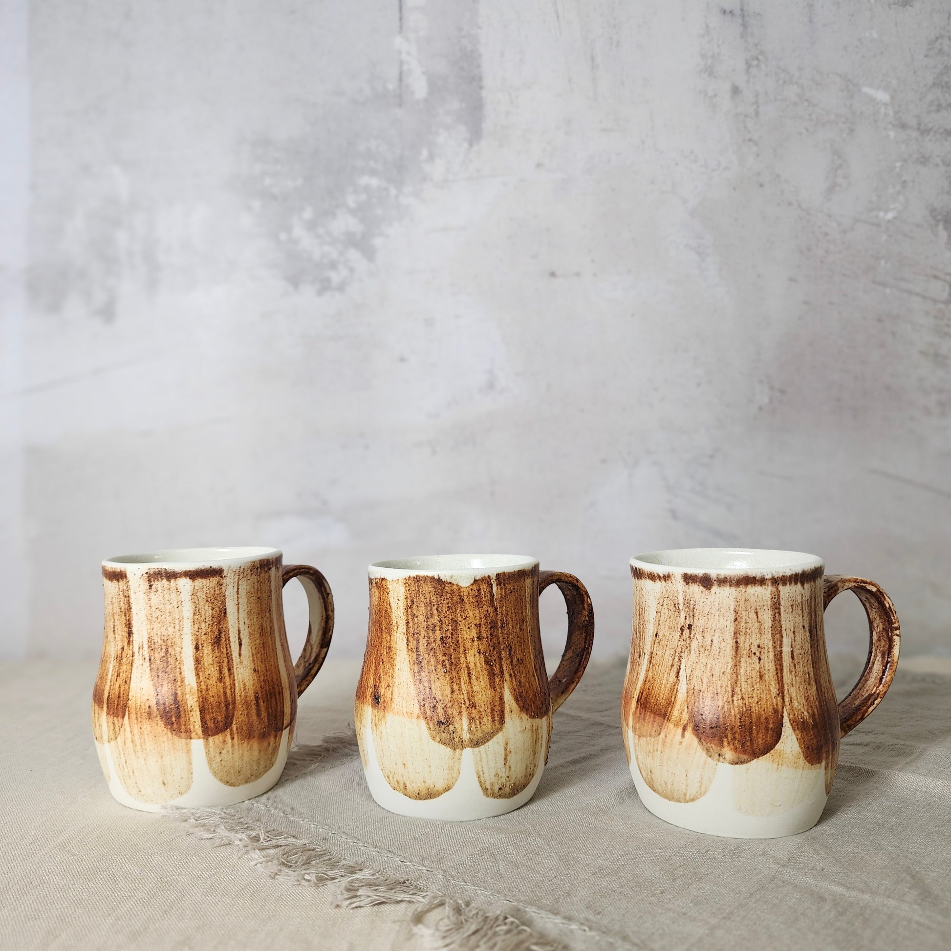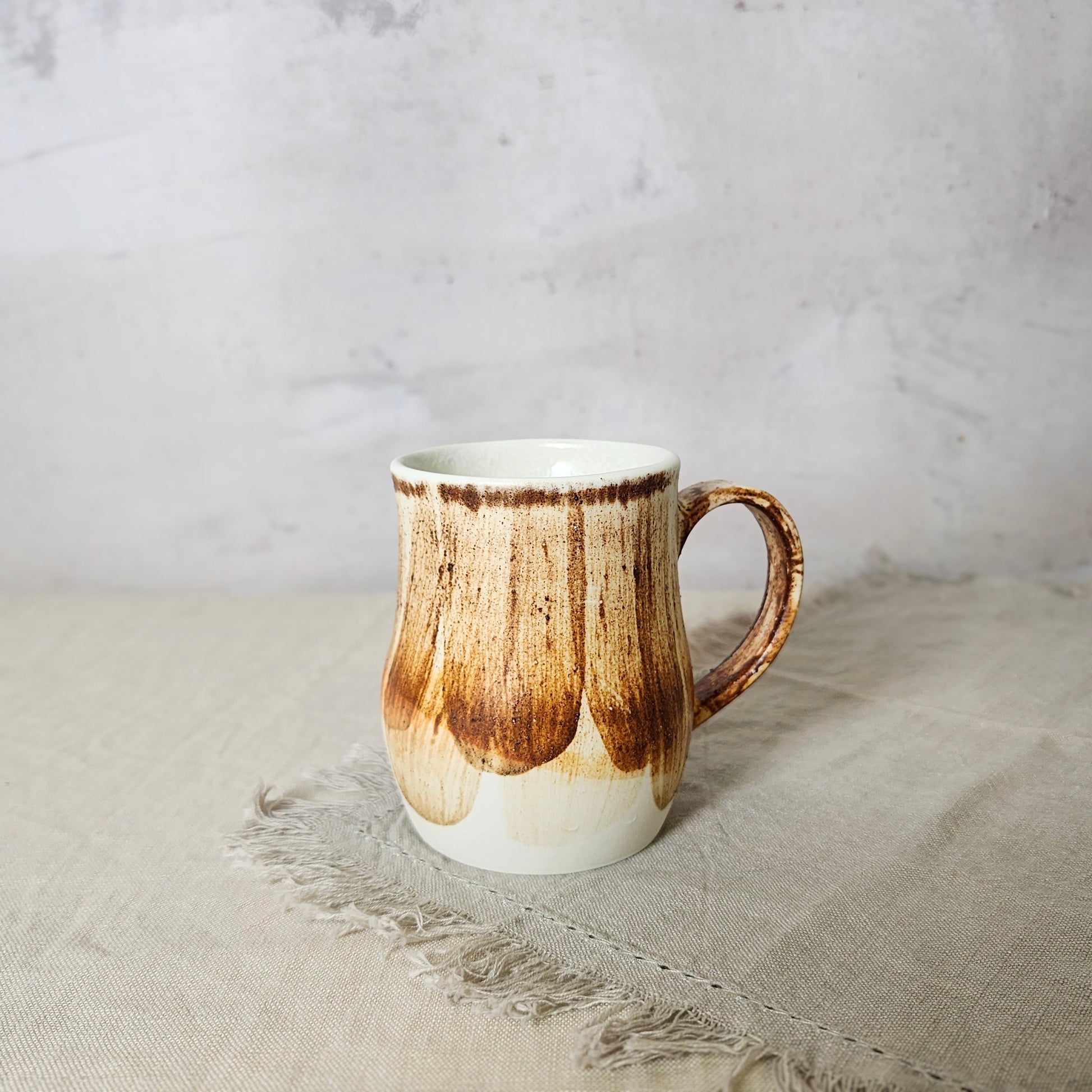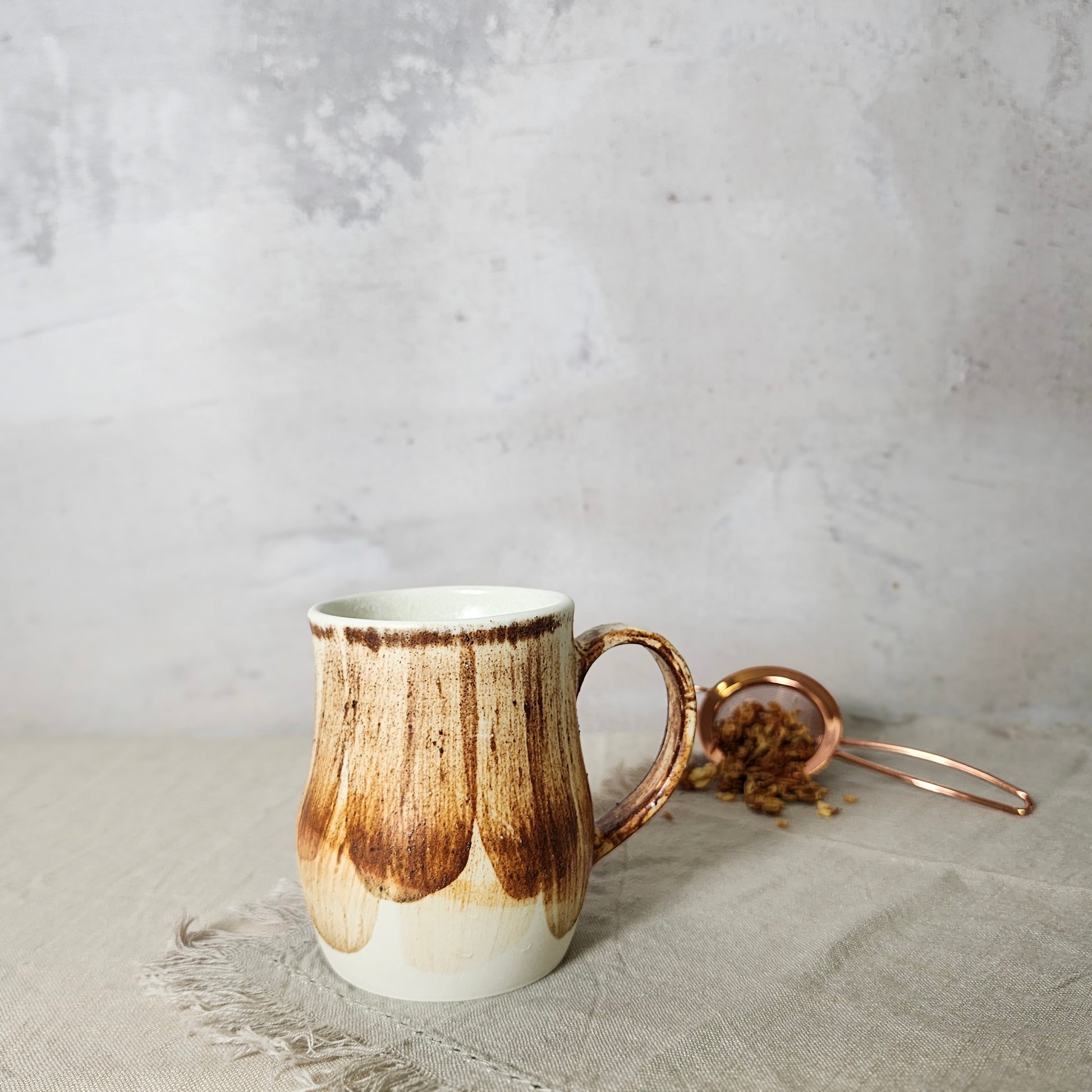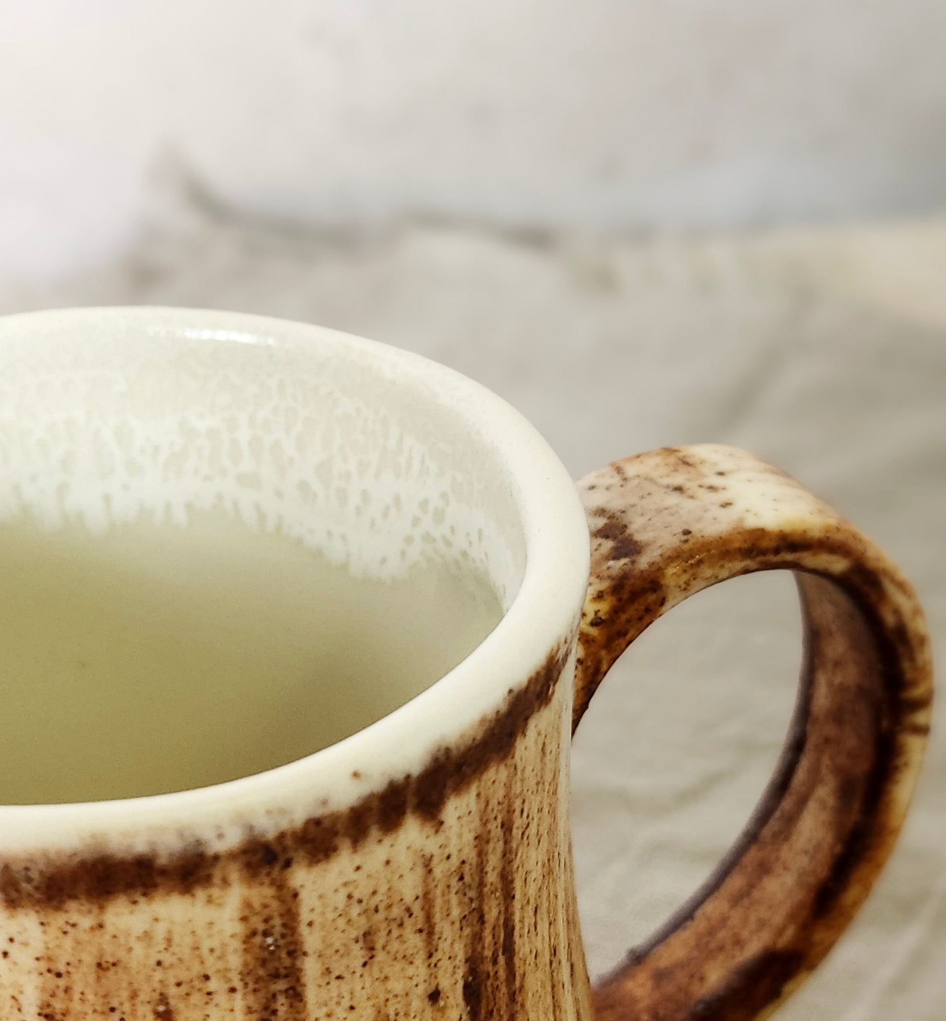 Minimalist ceramic coffee and tea "hug mug" embodies a modern aesthetic and charm, perfect for a cozy snuggle on the couch or in bed with hot chocolate or sticky chai. Ideal for indulging in your special morning rituals, it's a perfect gift for hot beverage enthusiasts. Handcrafted using white porcelain slip, this mug features a clear gloss glaze on the interior and a semi-matte white glaze on the exterior, enhancing the clay's unique texture. The mug's exterior is featured with a semi-white matte glaze, leaving the bottom exposed for a stone-like surface, showcasing the unique brush strokes. Each piece is fired to stoneware temperature, ensuring durability. Enjoying hot beverages in this mug not only provides warmth and comfort but also offers a nourishing moment of relaxation and rejuvenation.GREAT FOR: Fresh Coffee, Tea or Hot Chocolate