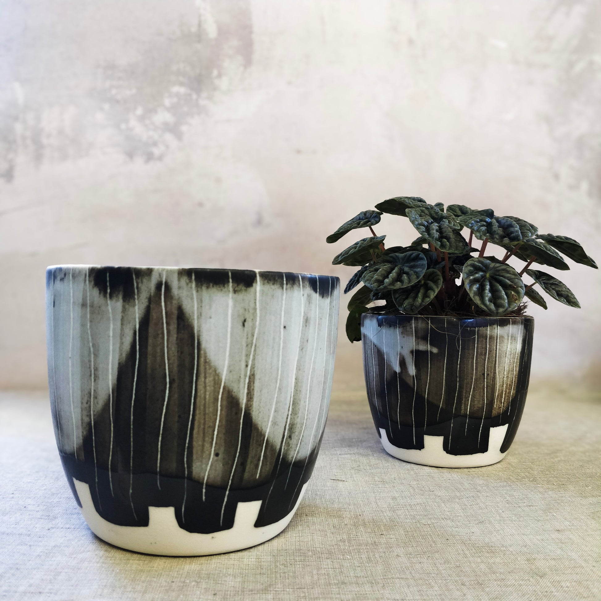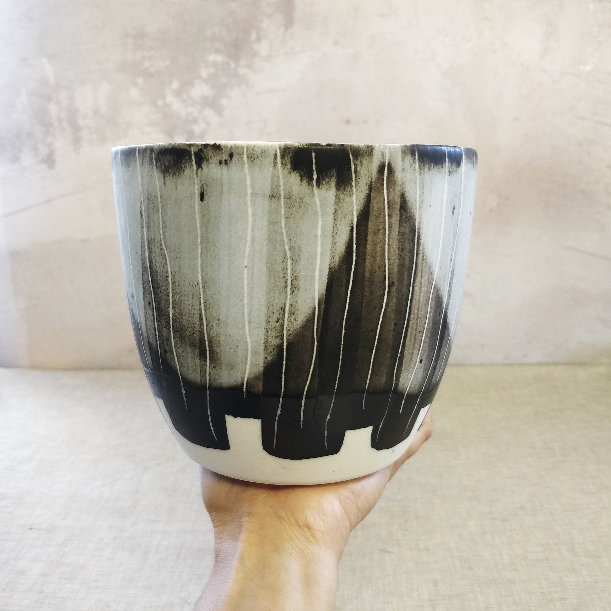 Introducing our handcrafted porcelain pot planter, featuring a bold brush stroke design crafted from Australian clay. Each pot is unique, as the brush strokes are individual and distinctive. This exquisite pot planter showcases a unique textural clay-inspired texture, with organic bold lines adding character to its contemporary form. It's timeless elegance makes it an ideal centrepiece or a graceful holder for your favourite plants. This planter is a great complement to your greens, lending a touch of sophistication to your home and office. Each potted plant is lovingly handcrafted, with a white gloss glaze adorning the interior and a semi-matte white texture gracing the top exterior for a refined finish.LARGE – 14cm H | 16.40cm D - approx